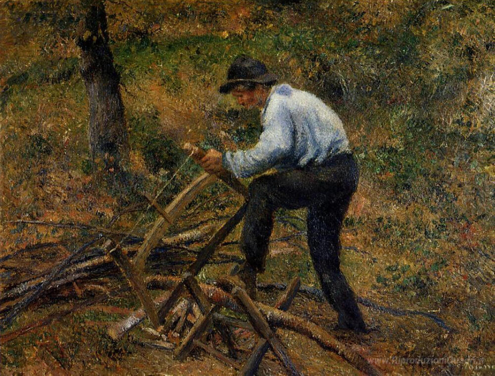 Ti offriamo una riproduzione artigianale su tela dell'opera famosa 'Pere Melone Taglio legno, Pontoise' di Camille Pissarro, dal Museo delle Riproduzioni.