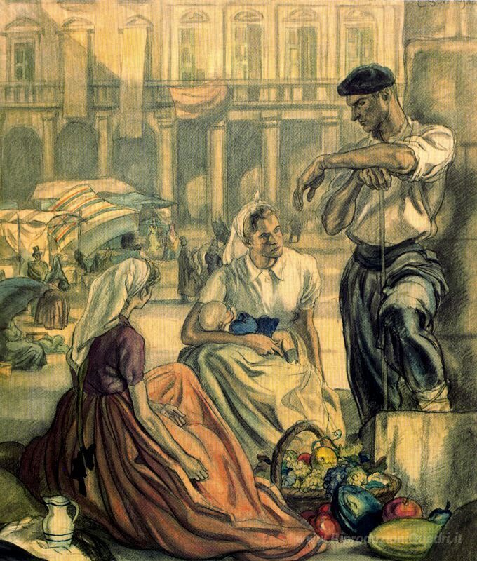 Ti offriamo una riproduzione artigianale su tela dell'opera famosa 'Piazza del Nuovo Mercato a Vitoria' di Carlos Saenz de Tejada, dal Museo delle Riproduzioni.