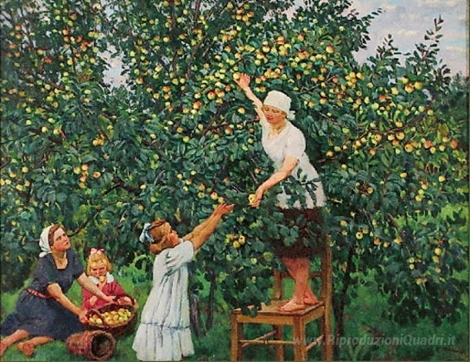 Scopri la bellezza senza tempo dei dipinti a olio italiani, dove ogni opera racconta una storia unica e affascinante. Oggi vi presentiamo Picking Mele, un capolavoro del rinomato artista Konstantin Yuon, un maestro della luce e del colore. Le sue opere sono caratterizzate da una straordinaria capacità di catturare l'essenza della vita quotidiana, immergendo lo spettatore in paesaggi vibranti e scene intime.