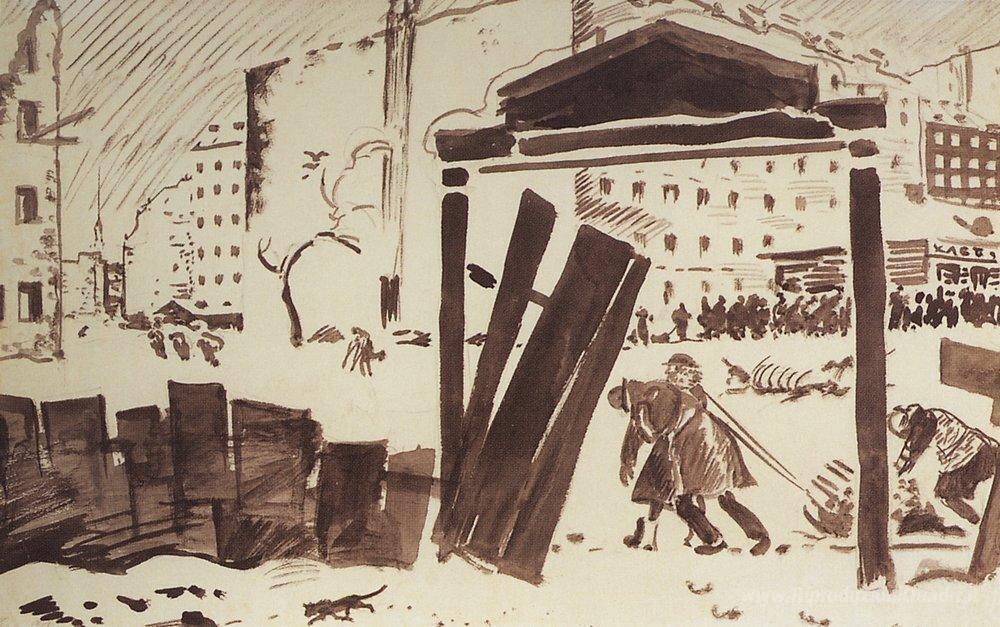 Ti offriamo una riproduzione artigianale su tela dell'opera famosa 'Pietrogrado nel 1919' di Boris Kustodiev, dal Museo delle Riproduzioni.