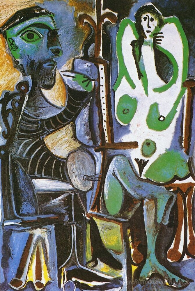 Ti offriamo una riproduzione artigianale su tela dell'opera famosa 'Pittore e il suo modello' di Pablo Picasso, dal Museo delle Riproduzioni.