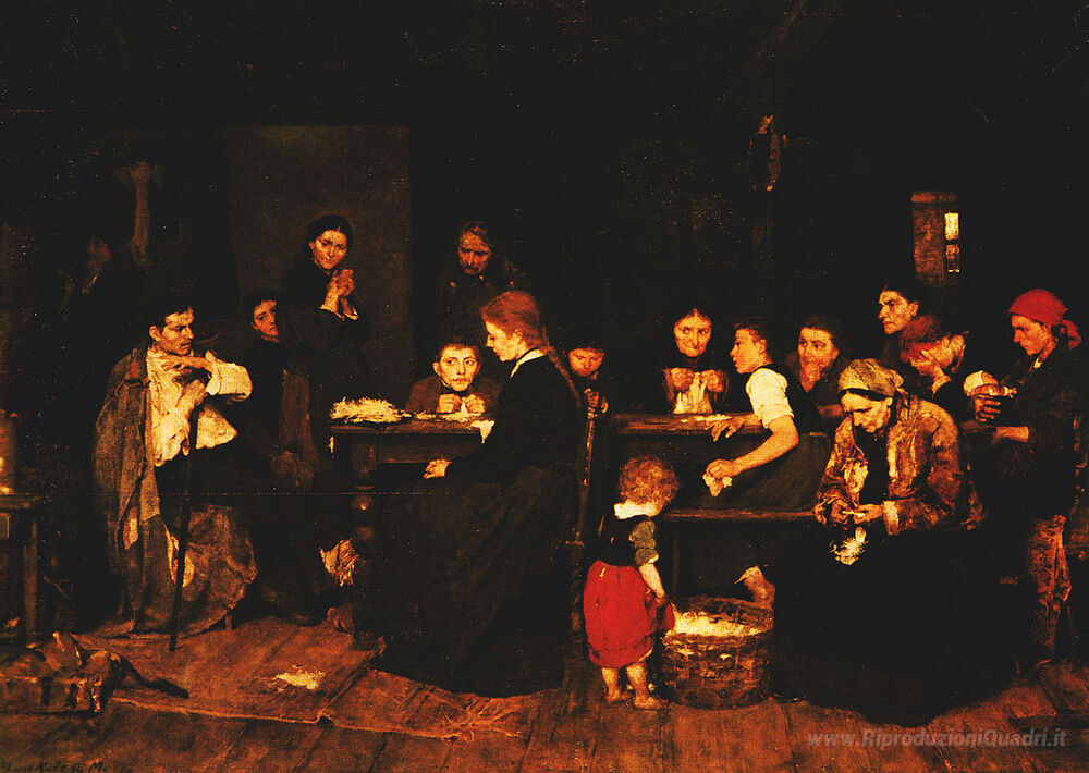 Ti offriamo una riproduzione artigianale su tela dell'opera famosa 'Pluckmakers' di Mihaly Munkacsy, dal Museo delle Riproduzioni.