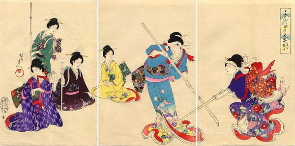 Ti offriamo una riproduzione artigianale su tela dell'opera famosa 'Praticare polo spada' di Toyohara Chikanobu, dal Museo delle Riproduzioni.