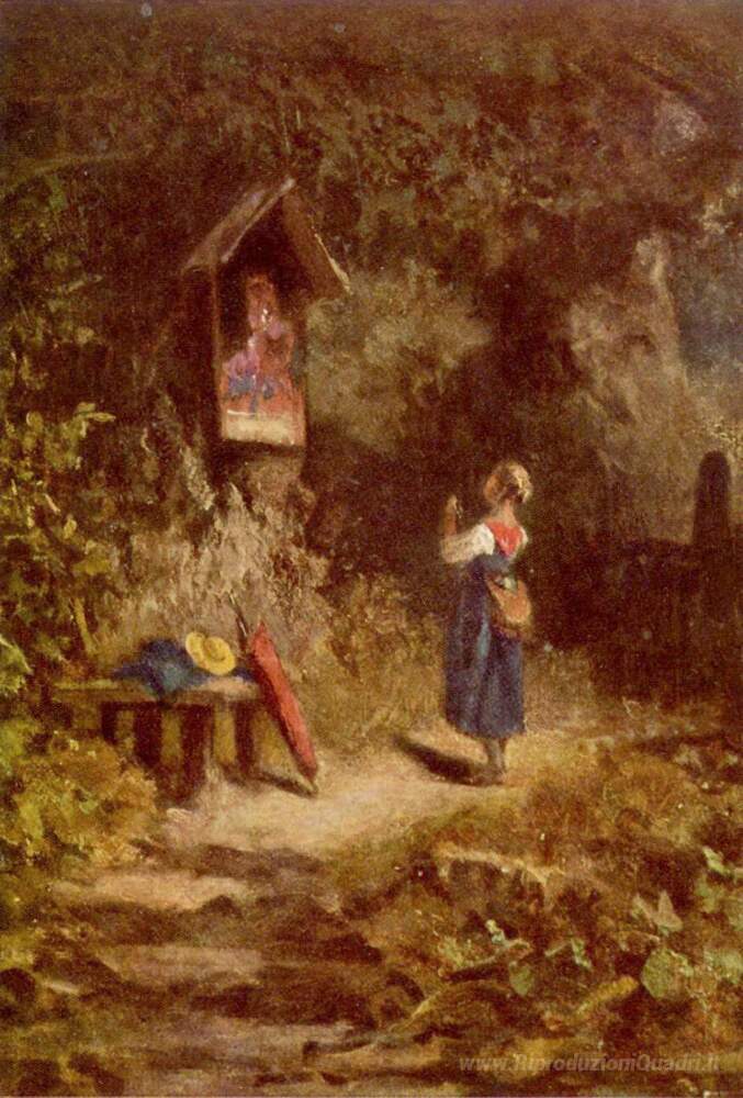Ti offriamo una riproduzione artigianale su tela dell'opera famosa 'Pregare contadina nel bosco' di Carl Spitzweg, dal Museo delle Riproduzioni.