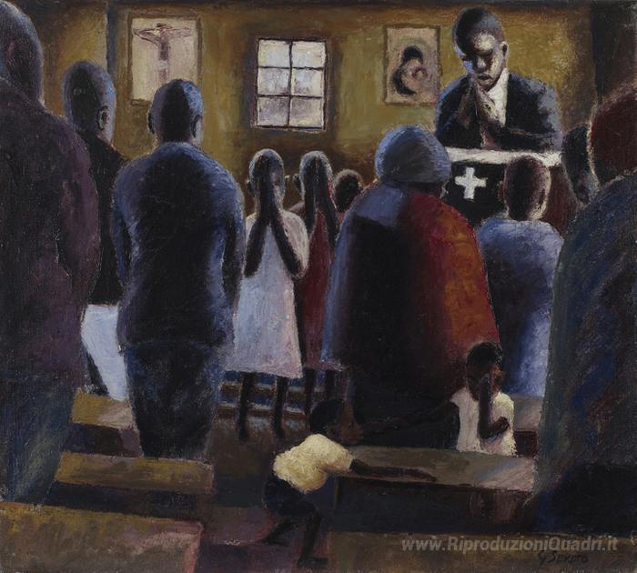 Ti offriamo una riproduzione artigianale su tela dell'opera famosa 'Preghiera in Chiesa' di Gerard Sekoto, dal Museo delle Riproduzioni.