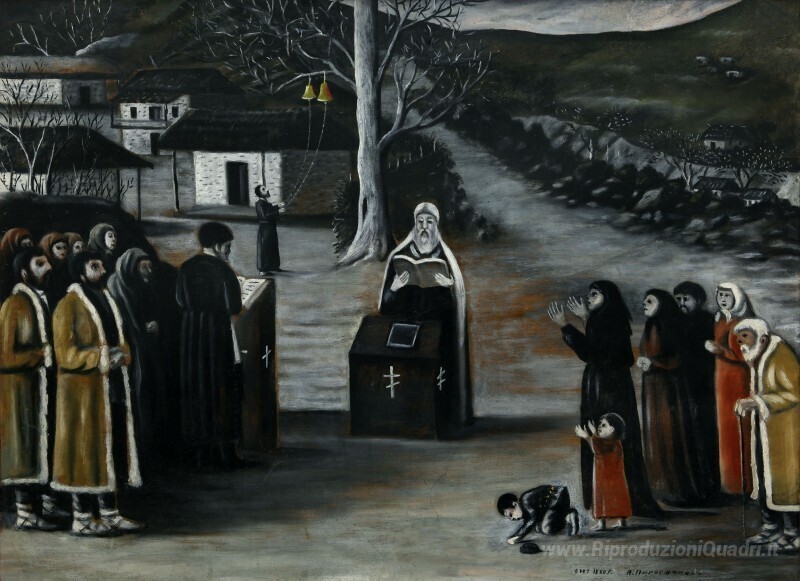 Ti offriamo una riproduzione artigianale su tela dell'opera famosa 'Preghiera in un villaggio' di Niko Pirosmani, dal Museo delle Riproduzioni.