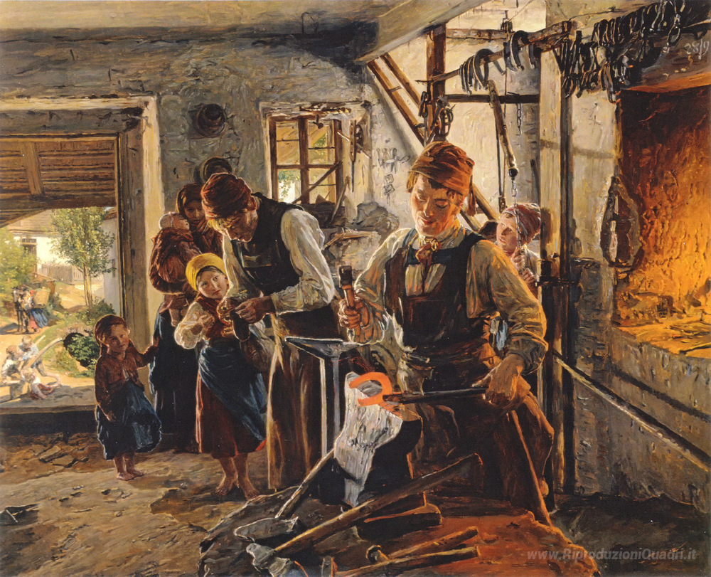 Ti offriamo una riproduzione artigianale su tela dell'opera famosa 'Presso il maniscalco' di Ferdinand Georg Waldmüller, dal Museo delle Riproduzioni.