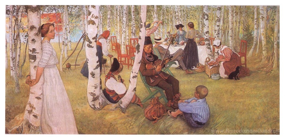 Ti offriamo una riproduzione artigianale su tela dell'opera famosa 'Prima colazione in mezzo al verde' di Carl Larsson, dal Museo delle Riproduzioni.