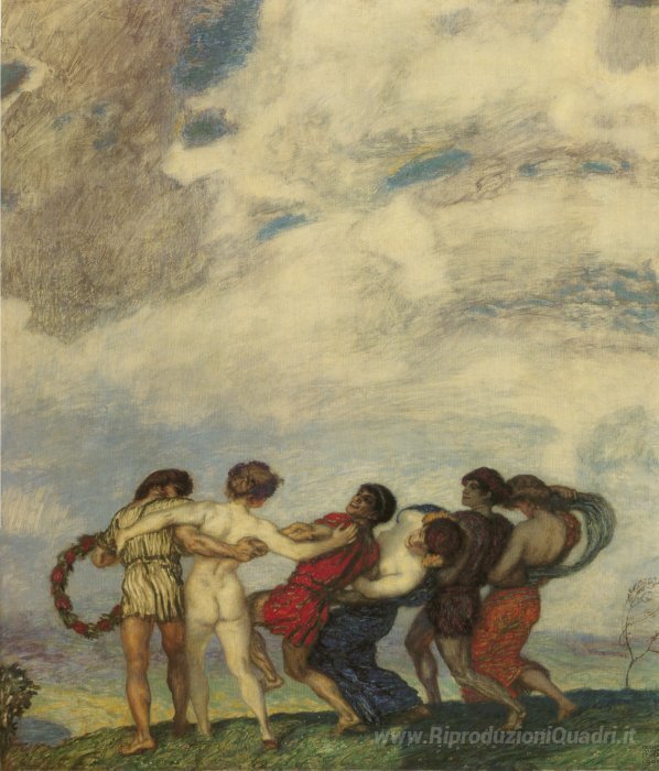 Ti offriamo una riproduzione artigianale su tela dell'opera famosa 'Primavera Danza' di Franz Stuck, dal Museo delle Riproduzioni.