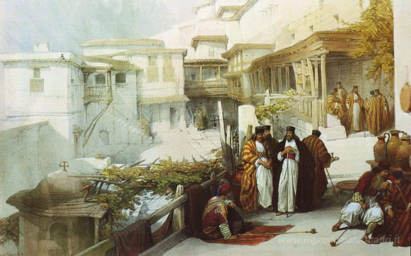 Ti offriamo una riproduzione artigianale su tela dell'opera famosa 'Principal Corte del Convento di Santa Caterina' di David Roberts, dal Museo delle Riproduzioni.