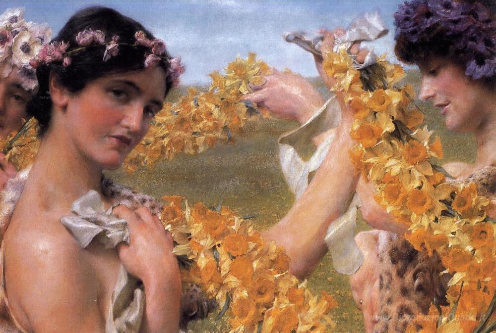 Ti offriamo una riproduzione artigianale su tela dell'opera famosa 'Quando Fiori di ritorno' di Sir Lawrence Alma-Tadema, dal Museo delle Riproduzioni.