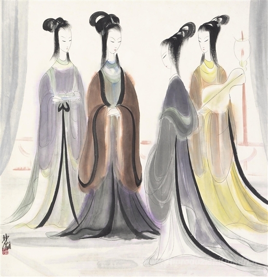 Ti offriamo una riproduzione artigianale su tela dell'opera famosa 'Quattro Bellezze' di Lin Fengmian, dal Museo delle Riproduzioni.