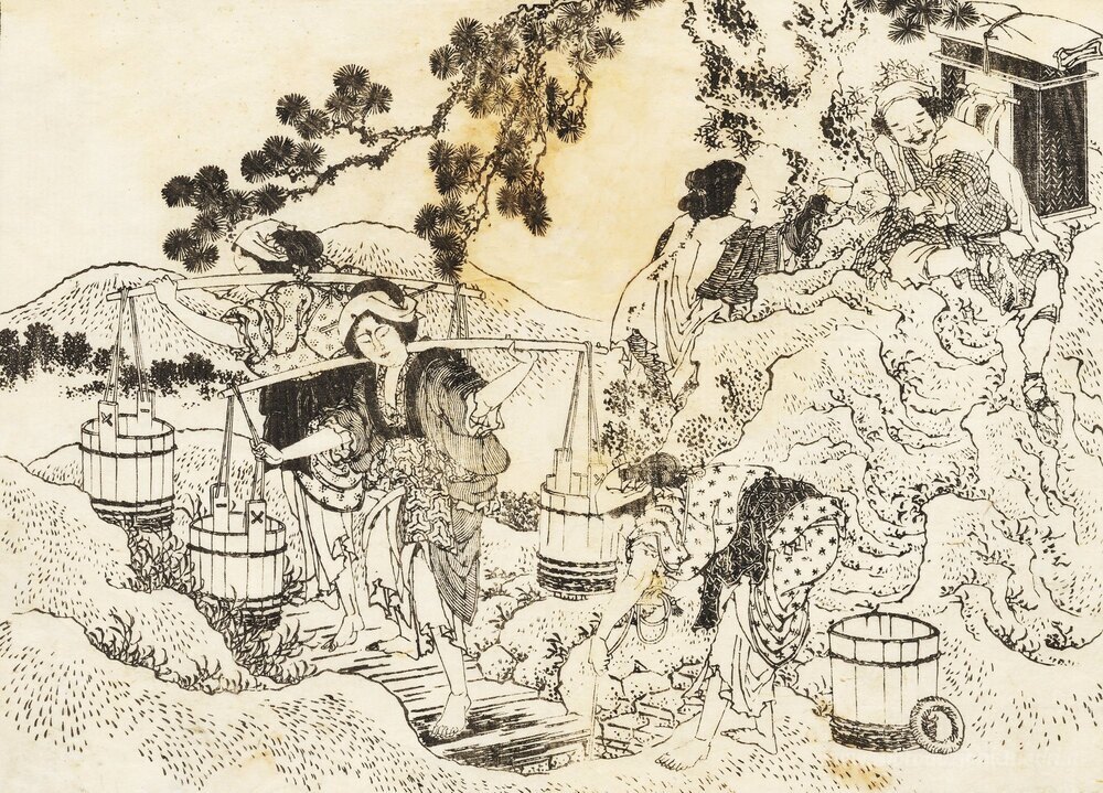 Ti offriamo una riproduzione artigianale su tela dell'opera famosa 'Quattro donne che lavorano molto duro e che trasportano vasche d' di Katsushika Hokusai, dal Museo delle Riproduzioni.