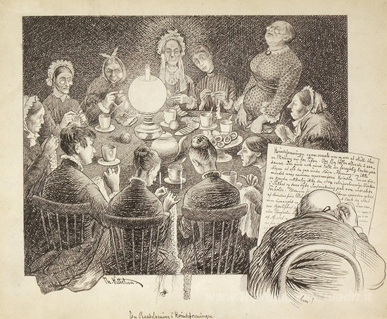Ti offriamo una riproduzione artigianale su tela dell'opera famosa 'Raadslagning I Kvinneforeningen' di Theodor Severin Kittelsen, dal Museo delle Riproduzioni.