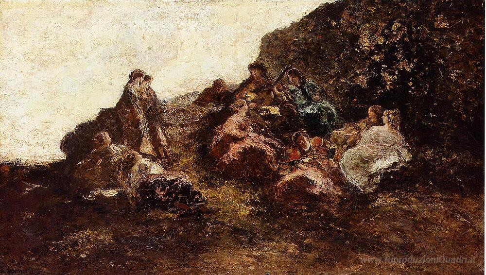 Ti offriamo una riproduzione artigianale su tela dell'opera famosa 'Raccolta di donne eleganti' di Adolphe Joseph Thomas Monticelli, dal Museo delle Riproduzioni.