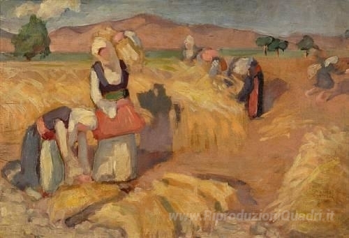 Ti offriamo una riproduzione artigianale su tela dell'opera famosa 'Raccolta' di Theophrastos Triantafyllidis, dal Museo delle Riproduzioni.