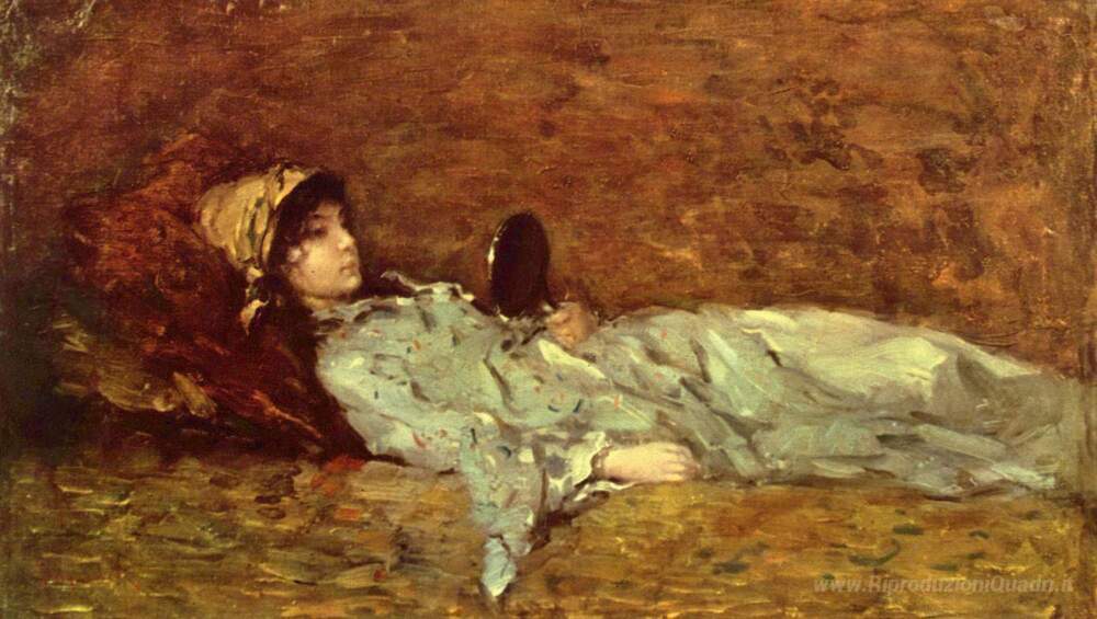 Ti offriamo una riproduzione artigianale su tela dell'opera famosa 'Ragazza allo specchio' di Nicolae Grigorescu, dal Museo delle Riproduzioni.