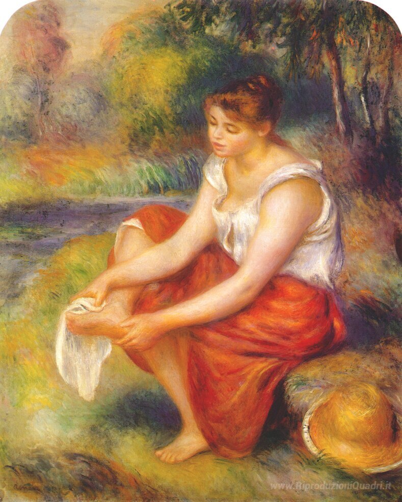 Ti offriamo una riproduzione artigianale su tela dell'opera famosa 'Ragazza che pulisce i suoi piedi' di Pierre-Auguste Renoir, dal Museo delle Riproduzioni.
