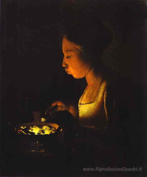 Ti offriamo una riproduzione artigianale su tela dell'opera famosa 'Ragazza con un Braciere' di Georges de la Tour, dal Museo delle Riproduzioni.