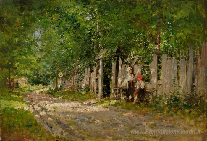 Ti offriamo una riproduzione artigianale su tela dell'opera famosa 'Ragazze che lavorano presso la porta' di Nicolae Grigorescu, dal Museo delle Riproduzioni.