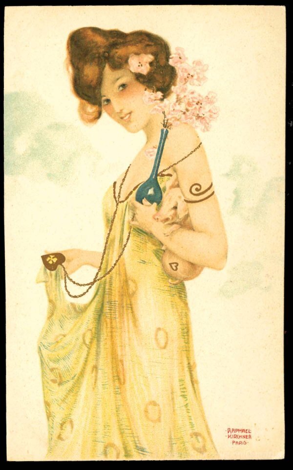 Ti offriamo una riproduzione artigianale su tela dell'opera famosa 'Ragazze con portafortuna' di Raphael Kirchner, dal Museo delle Riproduzioni.