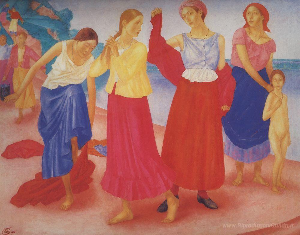 Ti offriamo una riproduzione artigianale su tela dell'opera famosa 'Ragazze sul Volga' di Kuzma Petrov-Vodkin, dal Museo delle Riproduzioni.