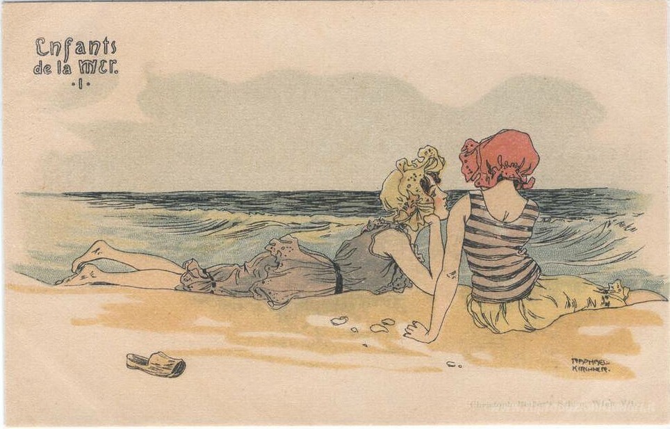 Ti offriamo una riproduzione artigianale su tela dell'opera famosa 'Ragazzi e ragazze in mare' di Raphael Kirchner, dal Museo delle Riproduzioni.