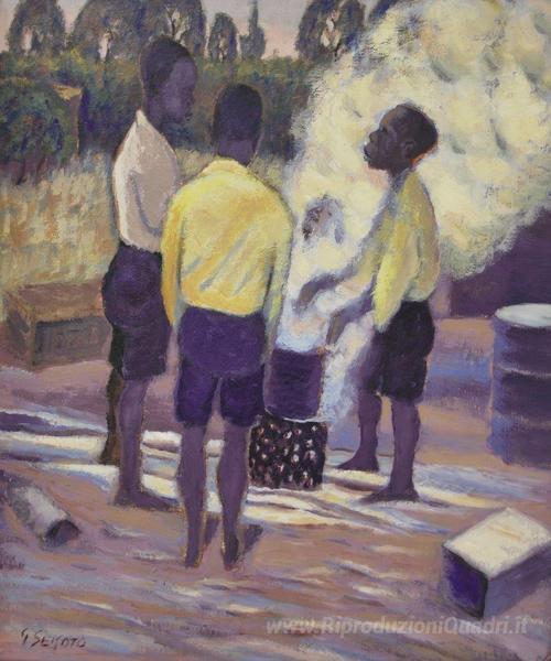 Ti offriamo una riproduzione artigianale su tela dell'opera famosa 'Ragazzi intorno un braciere, EASTWOOD' di Gerard Sekoto, dal Museo delle Riproduzioni.