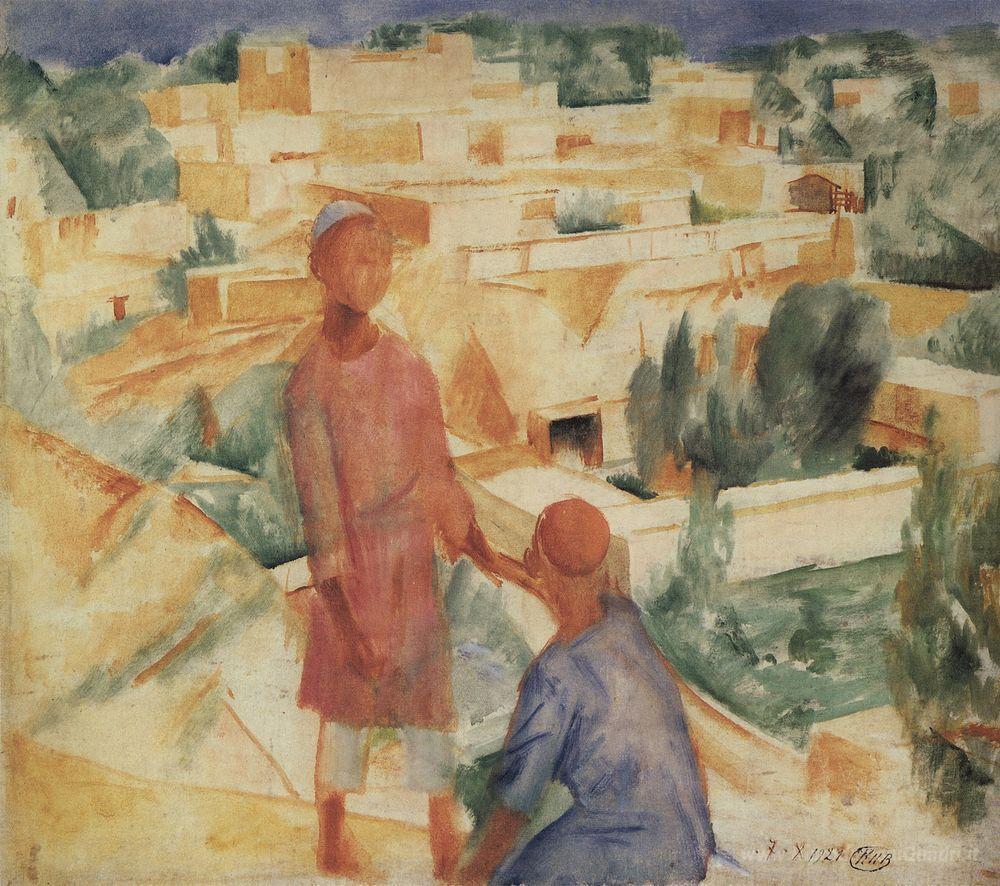 Ti offriamo una riproduzione artigianale su tela dell'opera famosa 'Ragazzi sullo sfondo della città' di Kuzma Petrov-Vodkin, dal Museo delle Riproduzioni.