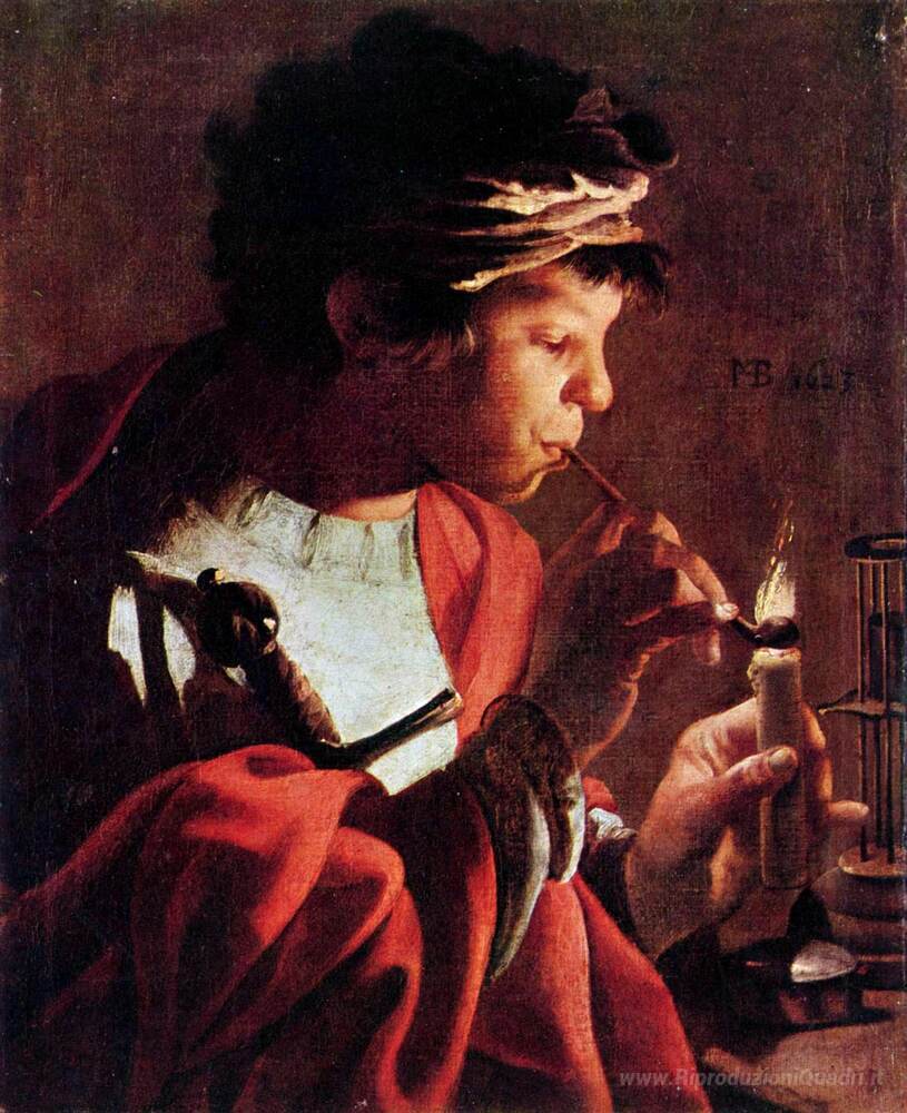 Ti offriamo una riproduzione artigianale su tela dell'opera famosa 'Ragazzo Illuminazione un tubo' di Hendrick Terbrugghen, dal Museo delle Riproduzioni.