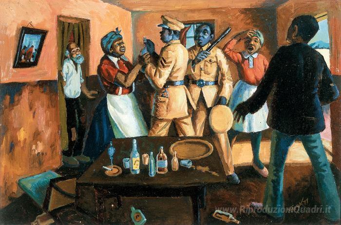 Ti offriamo una riproduzione artigianale su tela dell'opera famosa 'Raid della polizia' di George Pemba, dal Museo delle Riproduzioni.