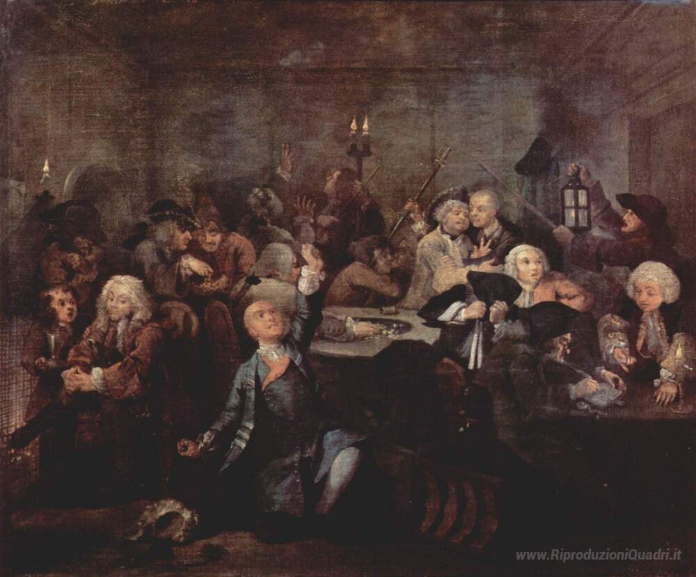 Ti offriamo una riproduzione artigianale su tela dell'opera famosa '?Rake Progress 'The Gaming Casa' di William Hogarth, dal Museo delle Riproduzioni.