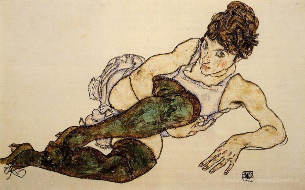 Ti offriamo una riproduzione artigianale su tela dell'opera famosa 'Reclining Woman with verdi Calze (Adele Harms)' di Egon Schiele, dal Museo delle Riproduzioni.