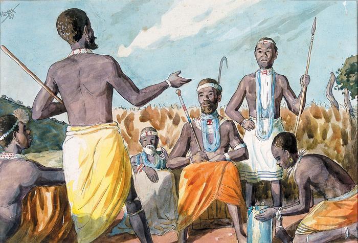 Ti offriamo una riproduzione artigianale su tela dell'opera famosa 'Rendendo omaggio al capo' di George Pemba, dal Museo delle Riproduzioni.