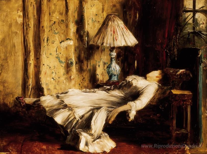Ti offriamo una riproduzione artigianale su tela dell'opera famosa 'Rilassante Lady' di Mihaly Munkacsy, dal Museo delle Riproduzioni.