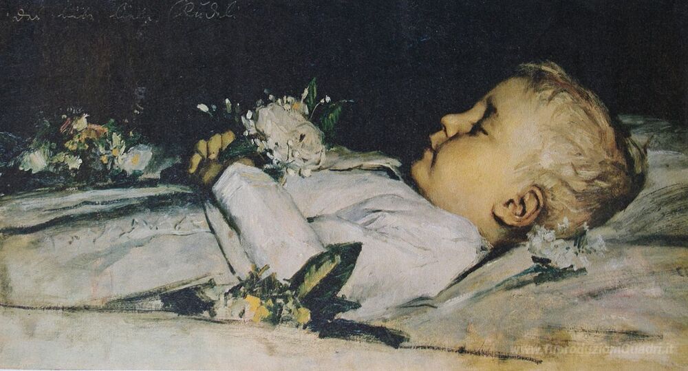 Ti offriamo una riproduzione artigianale su tela dell'opera famosa 'Ruedi Anker auf dem Totenbett, Sammlung Christoph Blocher' di Albert Anker, dal Museo delle Riproduzioni.