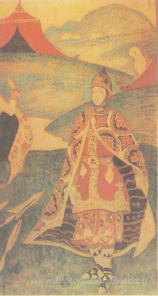 Ti offriamo una riproduzione artigianale su tela dell'opera famosa 'Russo guerriero' di Nicholas Roerich, dal Museo delle Riproduzioni.