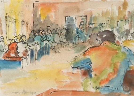 Ti offriamo una riproduzione artigianale su tela dell'opera famosa 'Sala da pranzo nel Kibbutz' di Avigdor Arikha, dal Museo delle Riproduzioni.