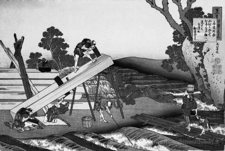 Ti offriamo una riproduzione artigianale su tela dell'opera famosa 'Sawyers Taglio di un registro' di Katsushika Hokusai, dal Museo delle Riproduzioni.