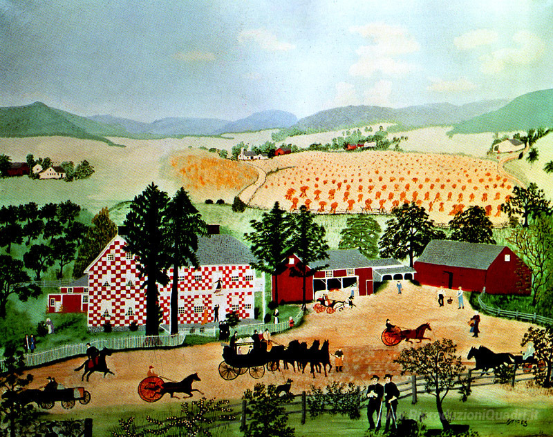 Ti offriamo una riproduzione artigianale su tela dell'opera famosa 'Scacchi Casa' di Grandma Moses, dal Museo delle Riproduzioni.