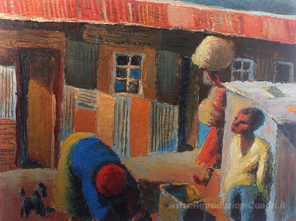 Ti offriamo una riproduzione artigianale su tela dell'opera famosa 'SCENA DELLA VIA' di Gerard Sekoto, dal Museo delle Riproduzioni.