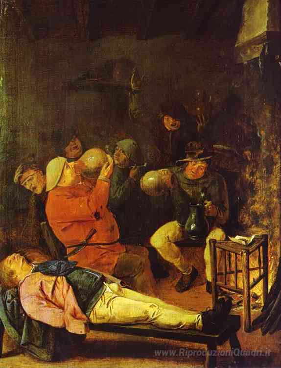Ti offriamo una riproduzione artigianale su tela dell'opera famosa 'Scena presso l'Inn' di Adriaen Brouwer, dal Museo delle Riproduzioni.