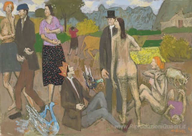 Ti offriamo una riproduzione artigianale su tela dell'opera famosa 'Scene de village aux oiseaux bleus' di Grégoire Michonze, dal Museo delle Riproduzioni.