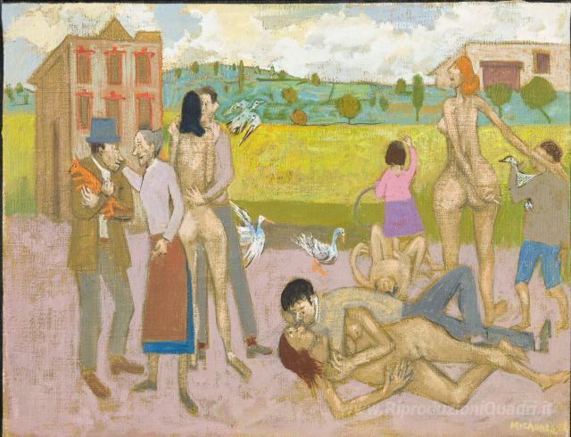 Ti offriamo una riproduzione artigianale su tela dell'opera famosa 'Scene de village' di Grégoire Michonze, dal Museo delle Riproduzioni.