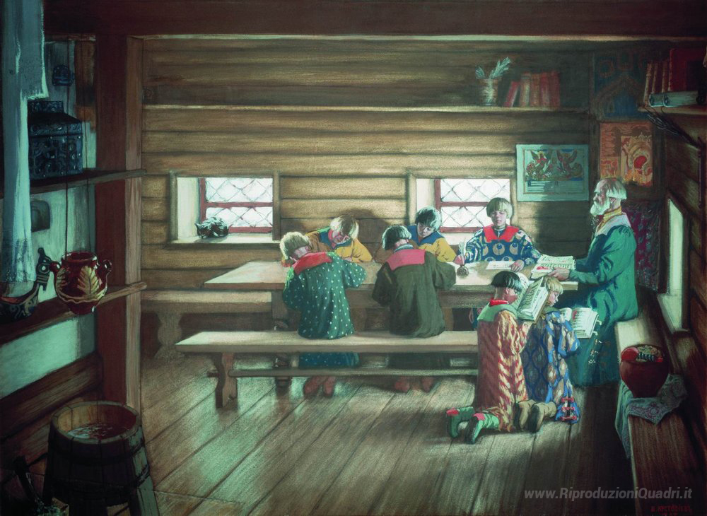 Ti offriamo una riproduzione artigianale su tela dell'opera famosa 'Scuola a Mosca, Russia' di Boris Kustodiev, dal Museo delle Riproduzioni.