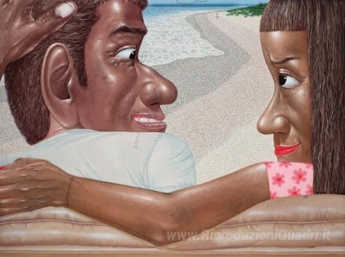 Ti offriamo una riproduzione artigianale su tela dell'opera famosa 'Sei sicuro?' di Nyoman Masriadi, dal Museo delle Riproduzioni.
