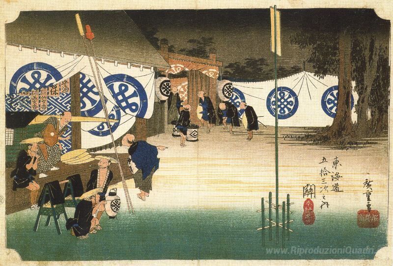 Ti offriamo una riproduzione artigianale su tela dell'opera famosa 'Seki: uscita prematura dal daimyo Inn' di Hiroshige, dal Museo delle Riproduzioni.