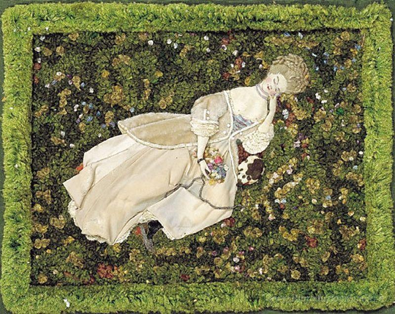 Ti offriamo una riproduzione artigianale su tela dell'opera famosa 'Signora con il cane, relax sul prato' di Konstantin Somov, dal Museo delle Riproduzioni.