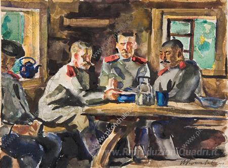 Ti offriamo una riproduzione artigianale su tela dell'opera famosa 'Soldati' di Pyotr Konchalovsky, dal Museo delle Riproduzioni.