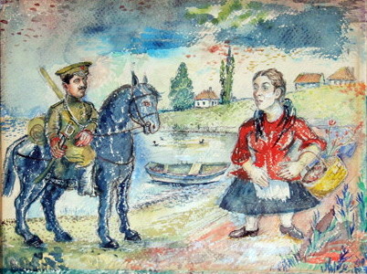 Ti offriamo una riproduzione artigianale su tela dell'opera famosa 'Soldato a cavallo' di David Burliuk, dal Museo delle Riproduzioni.